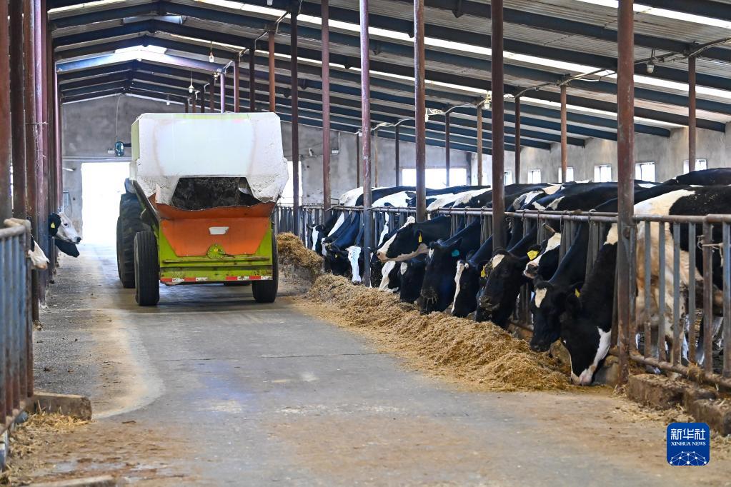 在新疆伊寧市巴彥岱鎮奶牛養殖場,工人駕駛自動撒料車喂牛(5月19日攝)。