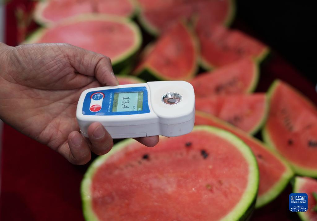 5月20日,評委在檢測參賽西瓜的糖分。
