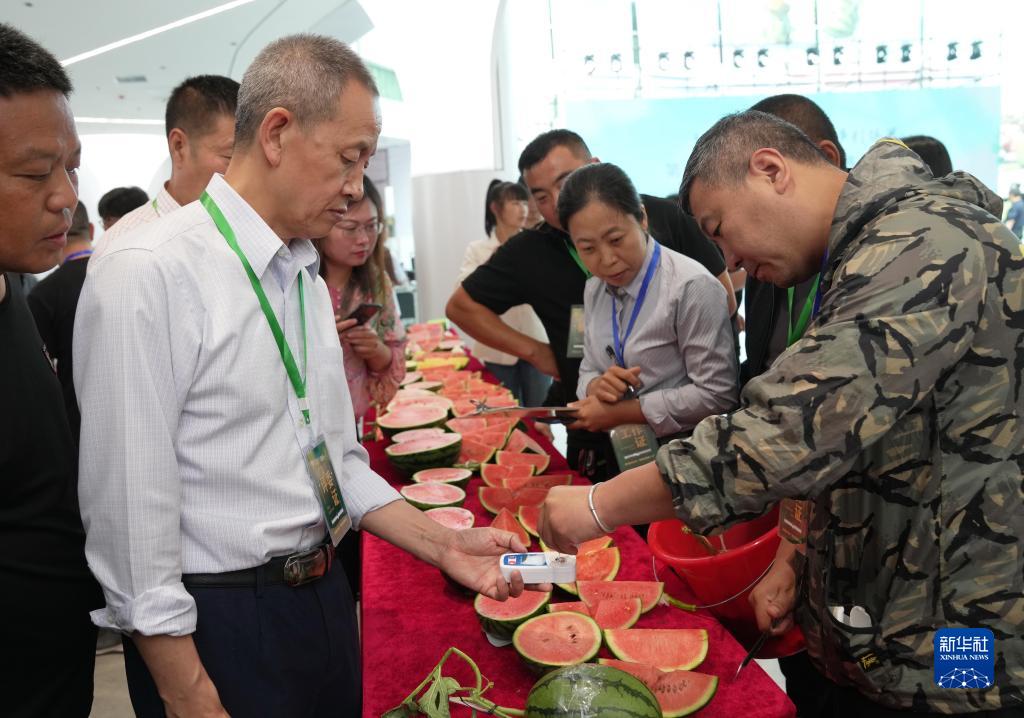 5月20日,評(píng)委在檢測(cè)參賽西瓜的糖分。