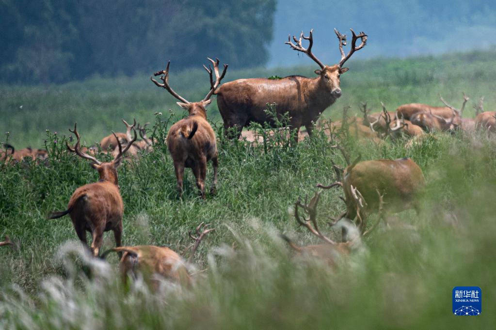 5月19日,一群麋鹿在湖北石首麋鹿國家級自然保護區內活動。