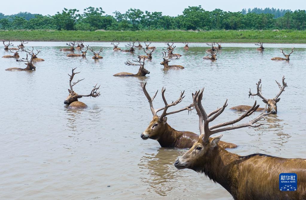 5月19日,一群麋鹿在湖北石首麋鹿國家級(jí)自然保護(hù)區(qū)內(nèi)活動(dòng)(無人機(jī)照片)。