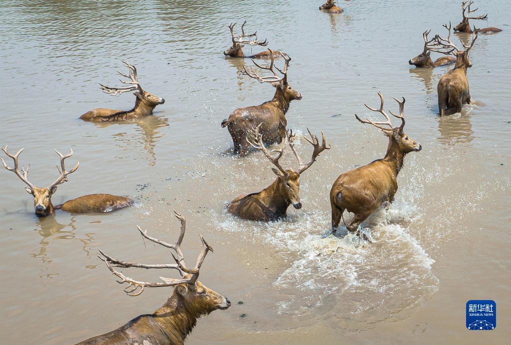 5月19日,一群麋鹿在湖北石首麋鹿國家級自然保護區內活動(無人機照片)。