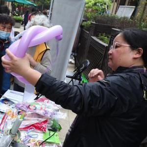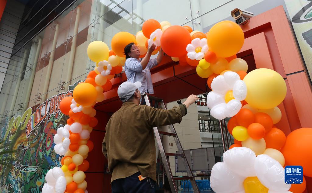 在上海虹口區青少年活動中心,劉瑩在伙伴的協助下為氣球拱門安裝花樣裝飾(5月18日攝)。