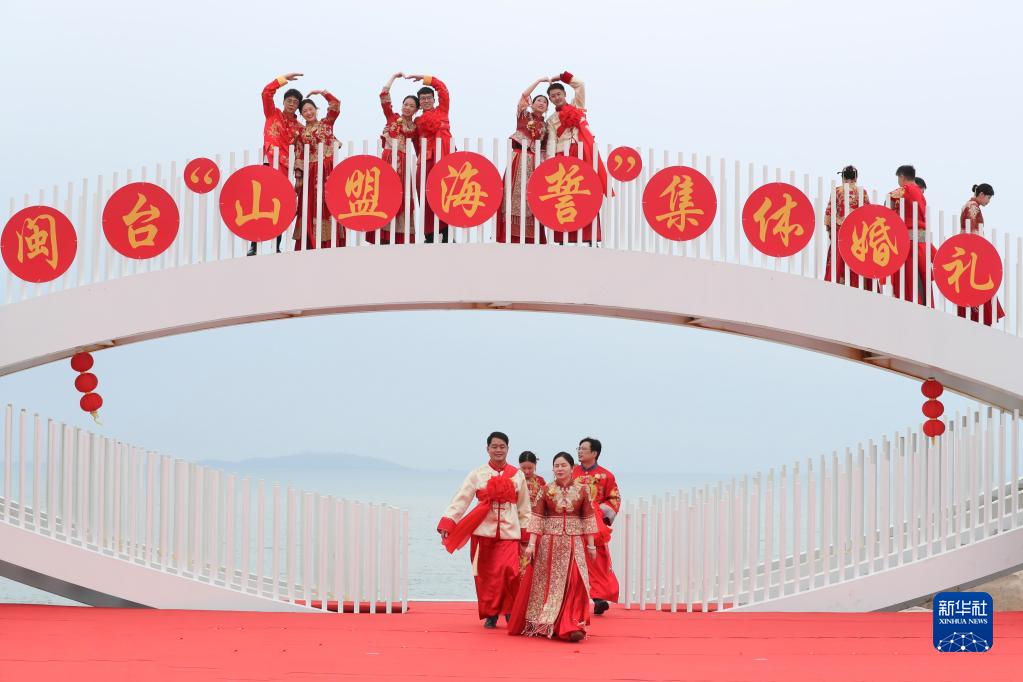當日,一場以“愛情恒久遠、幸福長相伴”為主題的閩臺“山盟海誓”集體婚禮暨2023年閩臺婚姻家庭交流活動在福建省福州市平潭縣舉辦。21對閩臺新人身穿紅色中式婚服,手牽紅繡球,行跨火盆、踩瓦片、扎繡球和“合茶”、“合巹”、“海誓”等閩臺傳統(tǒng)結婚禮儀,結下跨越海峽的姻緣。