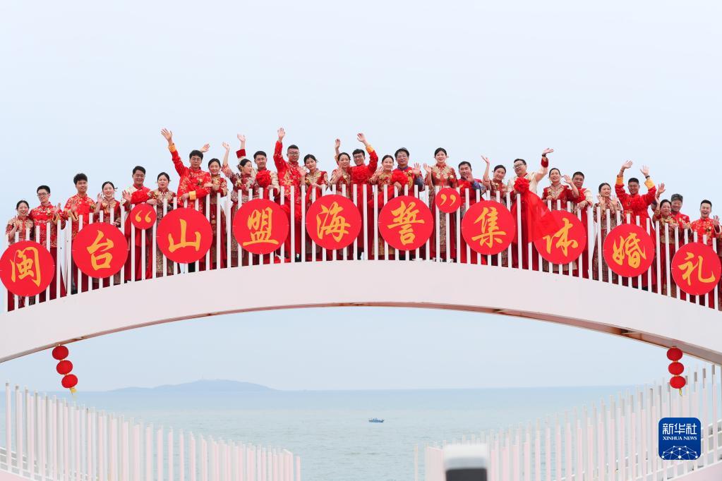 當日,一場以“愛情恒久遠、幸福長相伴”為主題的閩臺“山盟海誓”集體婚禮暨2023年閩臺婚姻家庭交流活動在福建省福州市平潭縣舉辦。21對閩臺新人身穿紅色中式婚服,手牽紅繡球,行跨火盆、踩瓦片、扎繡球和“合茶”、“合巹”、“海誓”等閩臺傳統結婚禮儀,結下跨越海峽的姻緣。