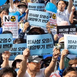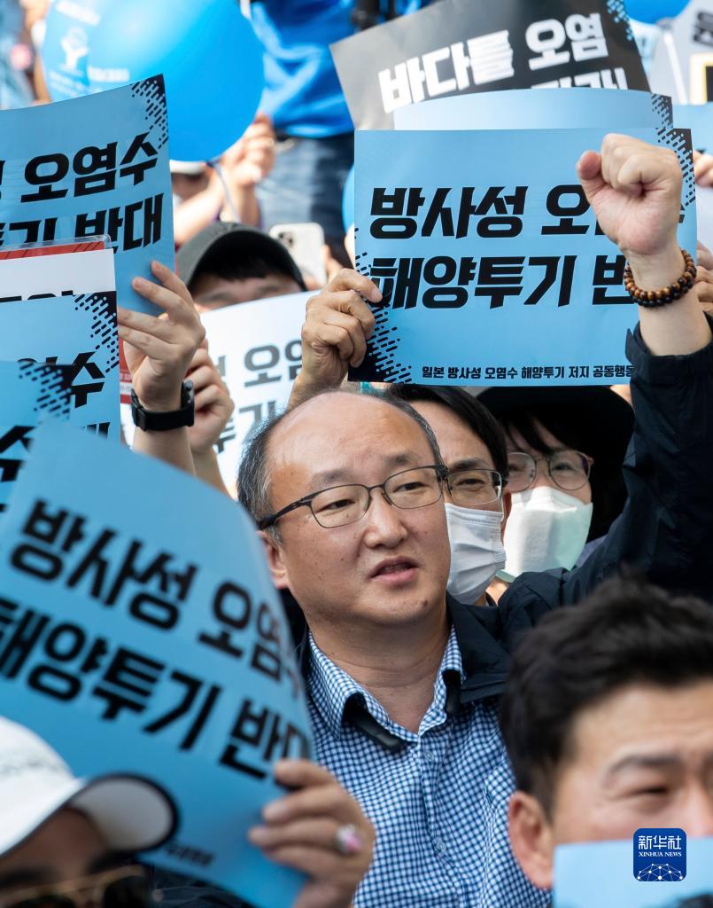 韓國多個市民團體20日在首爾市中心舉行集會,強烈反對日本政府將福島核污染水排入大海計劃。