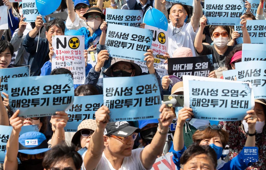 5月20日,民眾手舉“反對向海洋傾倒放射性污染水”等標語在韓國首爾參加集會。新華社發(李相浩攝)