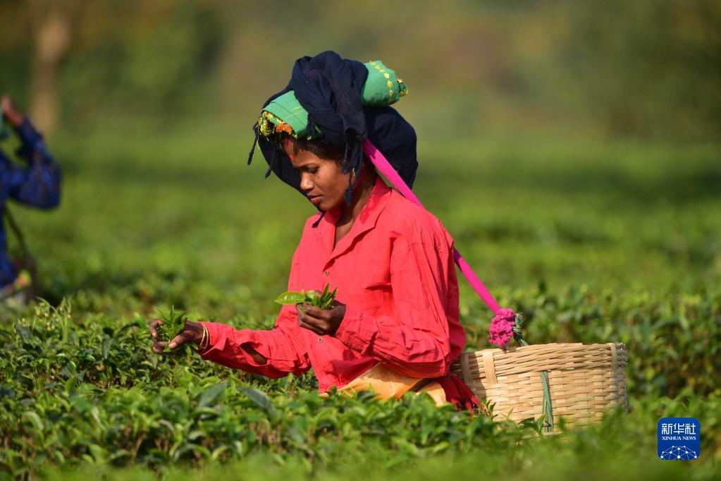 這是2023年3月14日,工人在印度阿薩姆邦納加奧恩地區(qū)的茶園里采摘茶葉。
