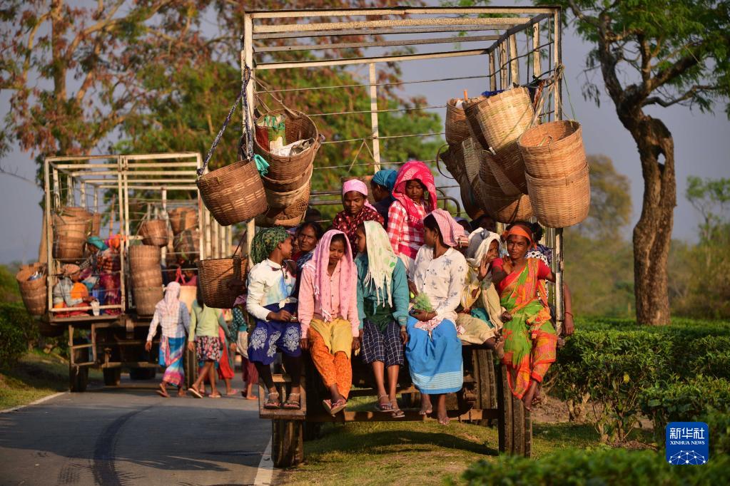 這是2023年3月14日,在印度阿薩姆邦納加奧恩地區(qū),工人采茶后乘車離開。