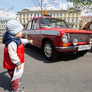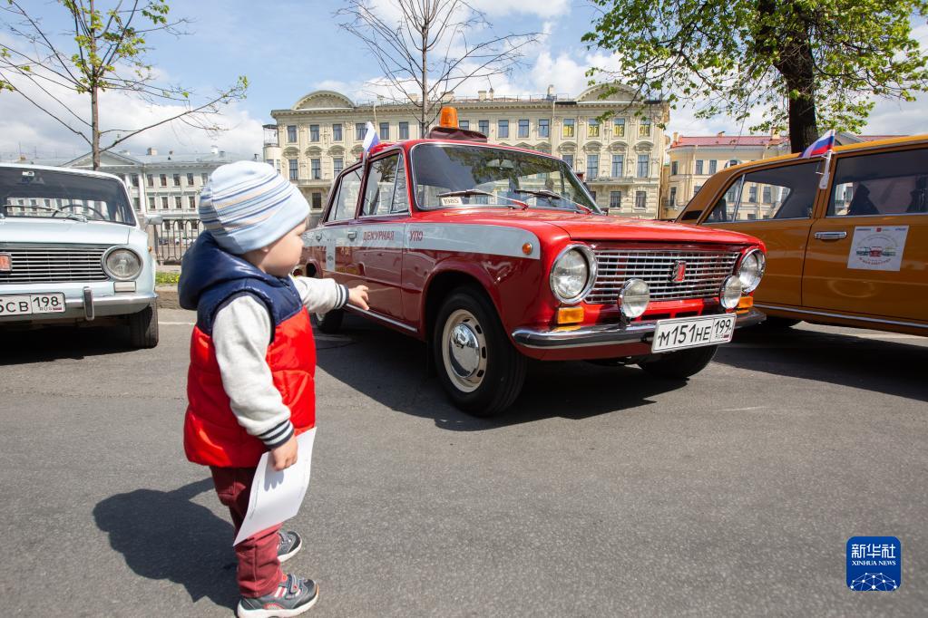 5月20日,小朋友在俄羅斯圣彼得堡參觀街頭老爺車展。