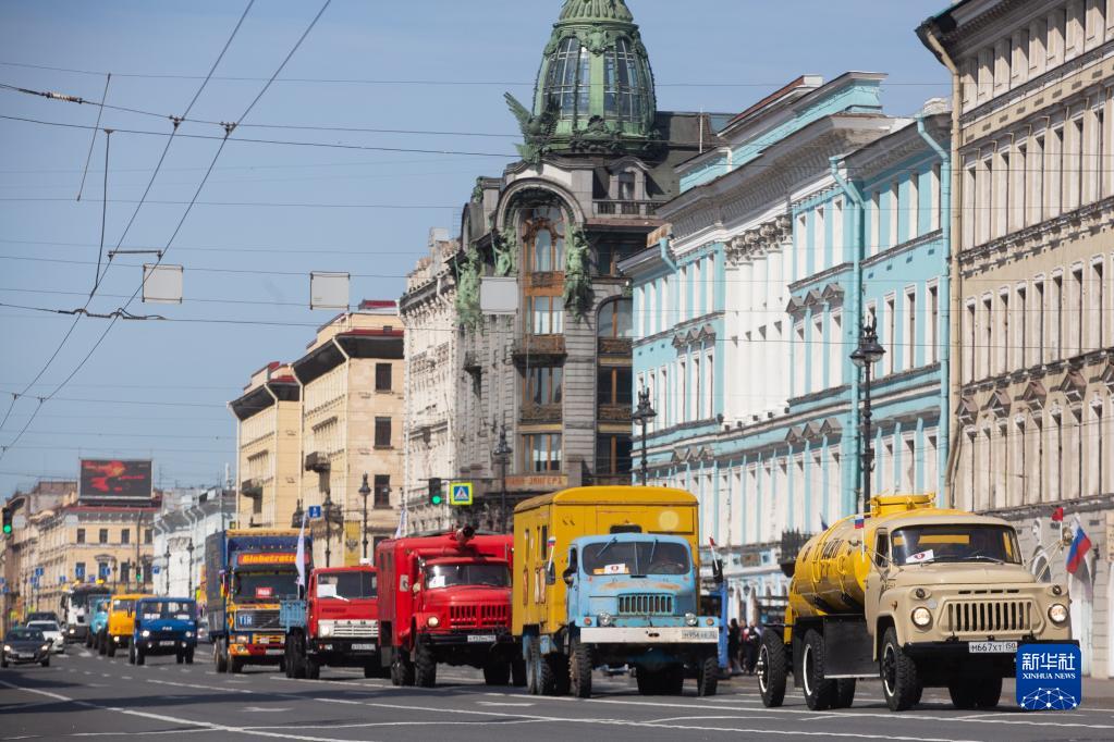 5月20日,各式老爺車在俄羅斯圣彼得堡街頭巡游。