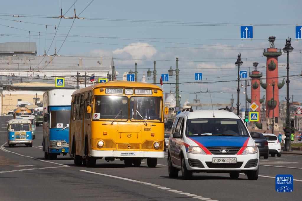 5月20日,各式老爺車在俄羅斯圣彼得堡街頭巡游。