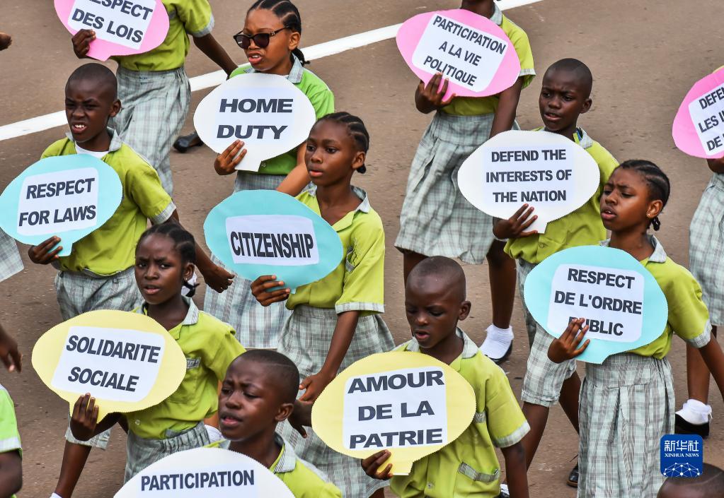 5月20日,在喀麥隆首都雅溫得舉行的國慶慶祝活動上,少年兒童手舉標語牌列隊行進。