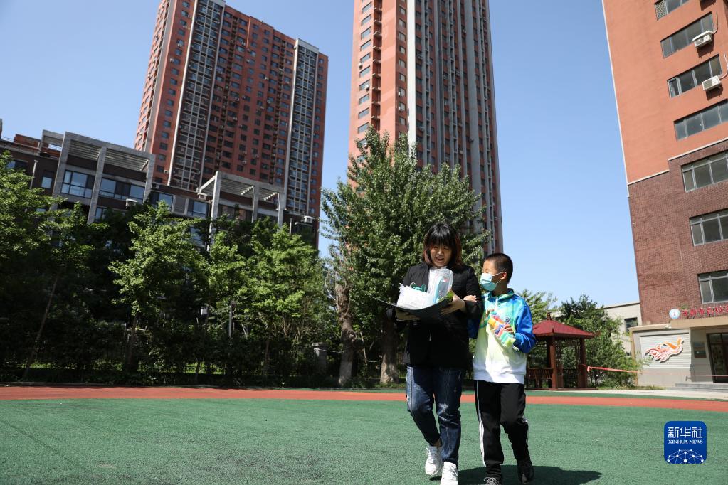 5月18日,戶外上課結束,莊巖帶著一名還不是很熟悉學校內路面環境的學生走回教室。