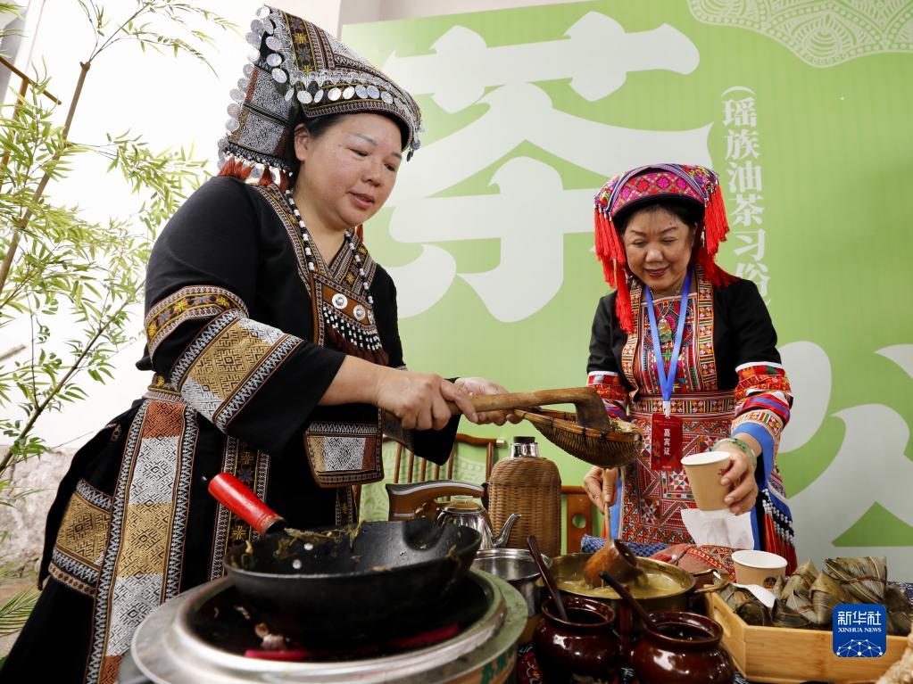5月21日,在茶文化非遺項目展示交流活動上,工作人員展示瑤族油茶習俗。