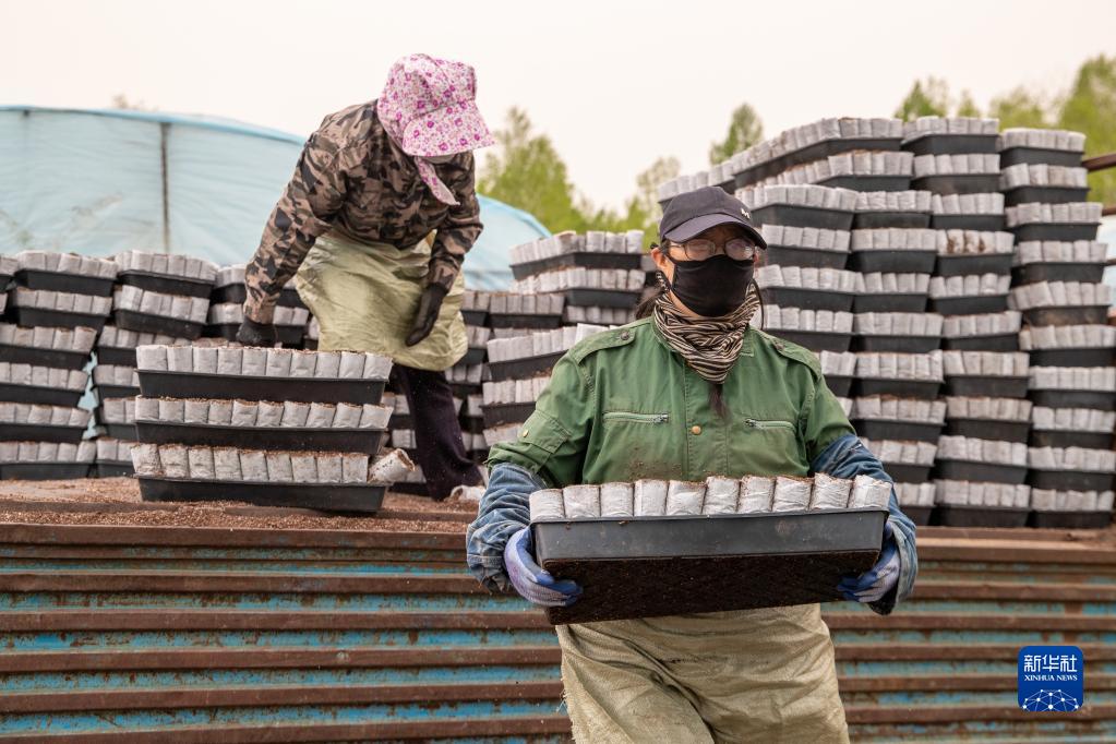 5月20日,在伊春森工集團紅松種苗繁育基地,工作人員在搬運輕基質容器。