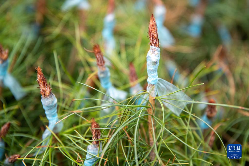 這是5月20日拍攝的伊春森工集團紅松種苗繁育基地輕基質容器內的紅松嫁接苗。