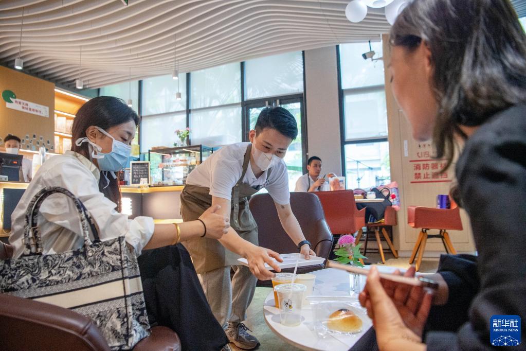 5月5日,在位于重慶市渝北區松山醫院內的一角咖啡廳內,張凌云(中)為顧客送上飲品。