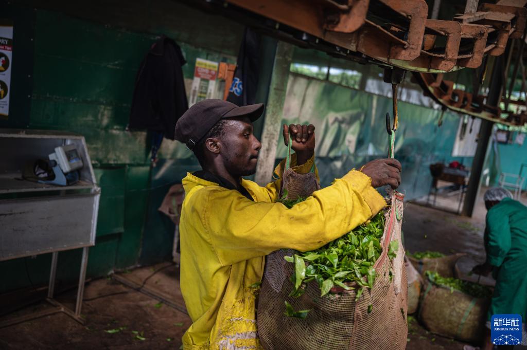 這是2023年5月4日,工人在肯尼亞首都內羅畢附近的茶廠里搬運茶葉。