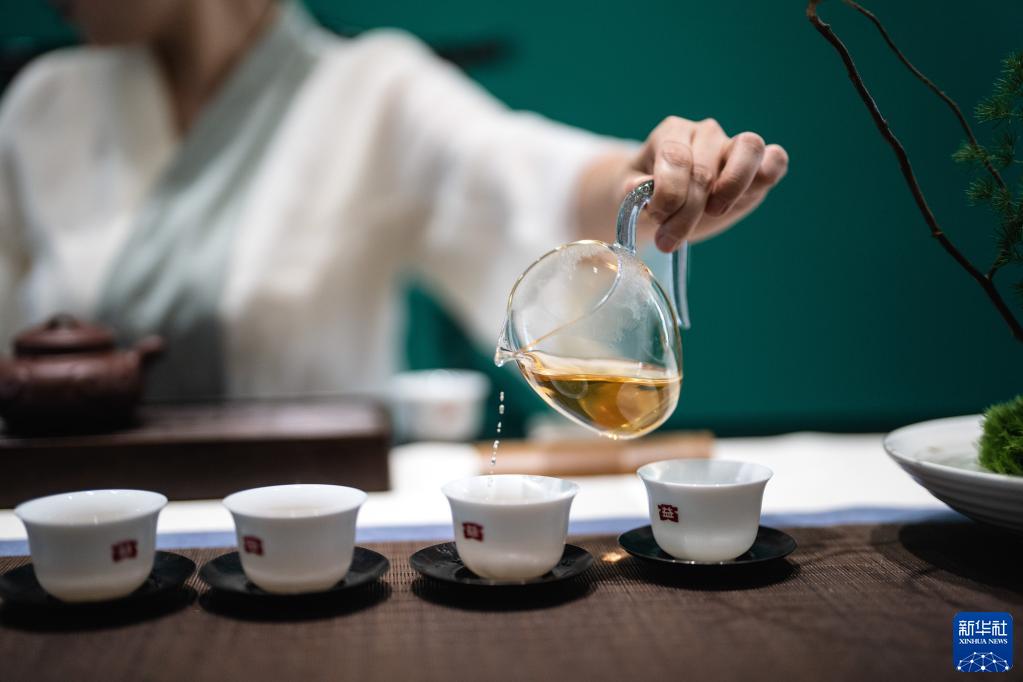 這是2023年5月18日,中國云南省勐海縣勐海茶廠的茶道師在展示茶道。
