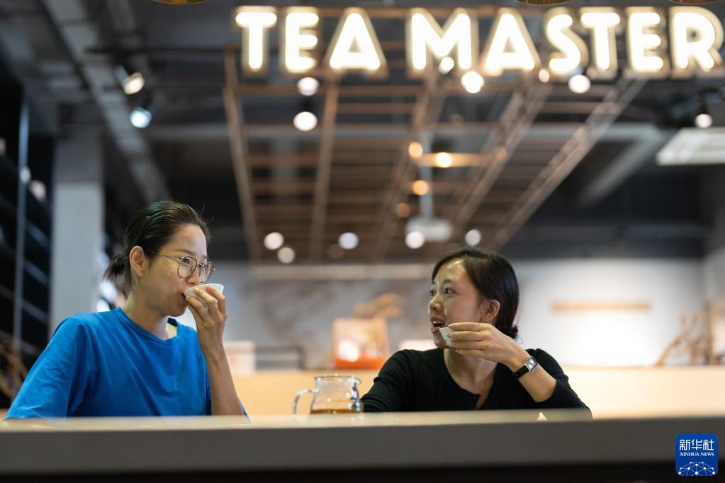 這是2023年5月18日,兩名茶客在中國云南省勐??h一處茶館品嘗普洱茶。