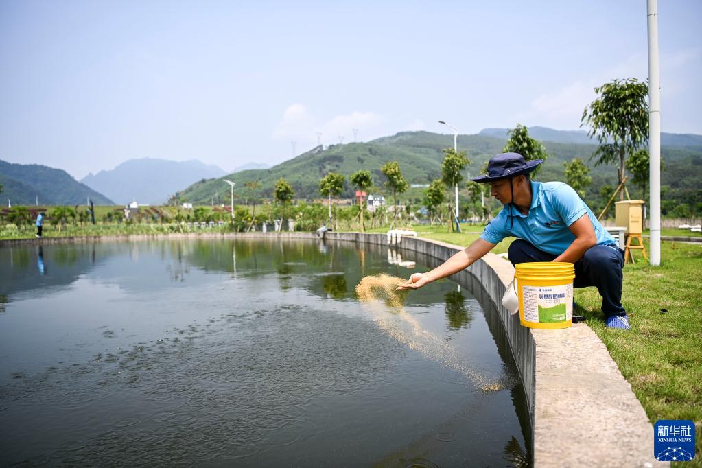 5月20日,技術人員在廣西大藤峽水利樞紐工程魚類增殖放流站向戶外育魚池內投喂飼料。
