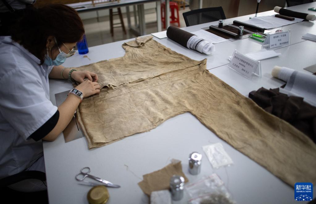 5月20日,在荊州文物保護(hù)中心,修復(fù)人員劉一丹修復(fù)一件南宋紡織品。