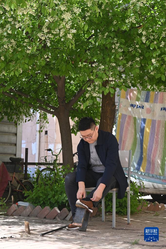 趙強在陽光家園門前的小區(qū)樹下整理鞋帶(4月18日攝)。