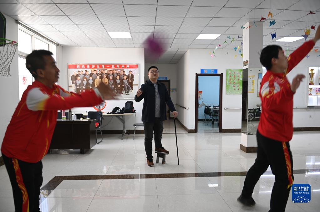 趙強(中)在陽光家園指導(dǎo)學(xué)員練習(xí)籃球(4月18日攝)。