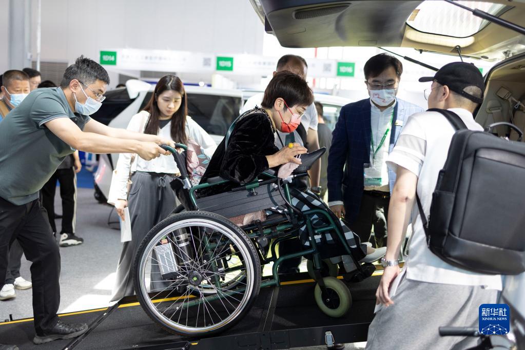 5月21日,在2023中國國際福祉博覽會上,參觀者體驗福祉汽車。福祉車專門為行動不便人群設計,為坐輪椅的乘客提供了升降平臺,汽車座椅也可伸出車外,方便乘客上下車。