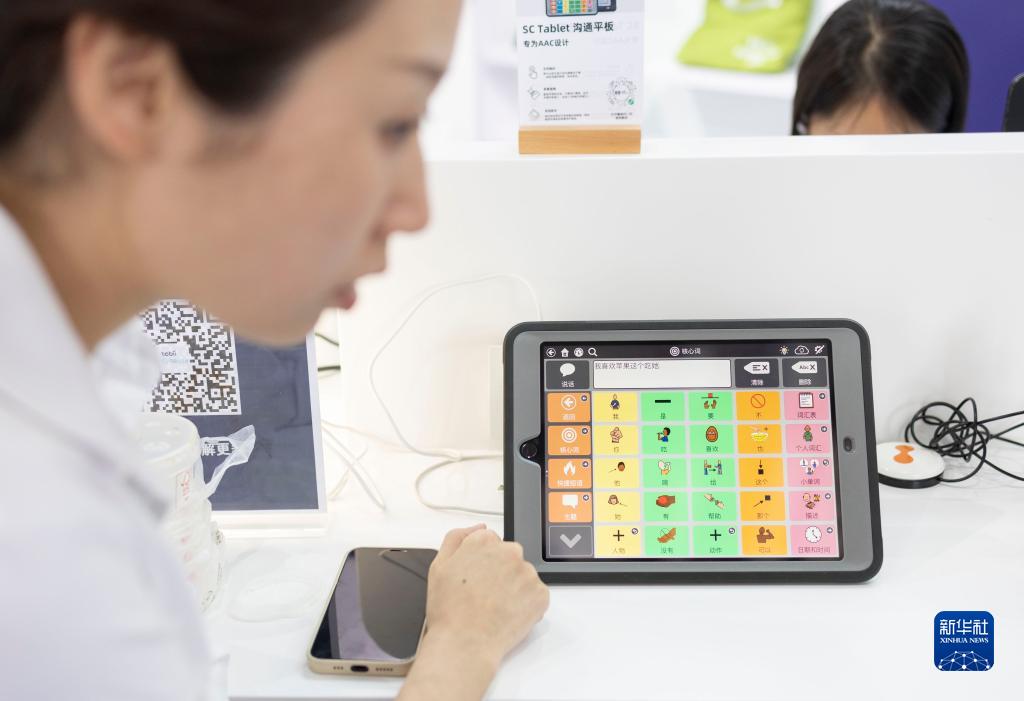 5月21日,在2023中國國際福祉博覽會上,一名工作人員演示SC Tablet溝通平板。這款設備可供自閉癥人群通過點選平板的各種表情符號表達需求,實現與家人的溝通交流。