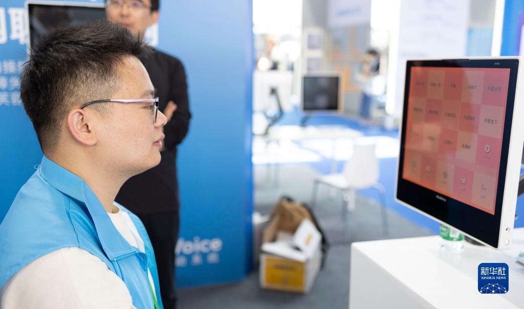 5月21日,在2023中國國際福祉博覽會上,一名工作人員演示“mind voice”心語眼動系統(tǒng)。該系統(tǒng)可讓殘障人士通過注視屏幕并轉(zhuǎn)動眼球?qū)崿F(xiàn)與他人溝通需求、輸入文字等。