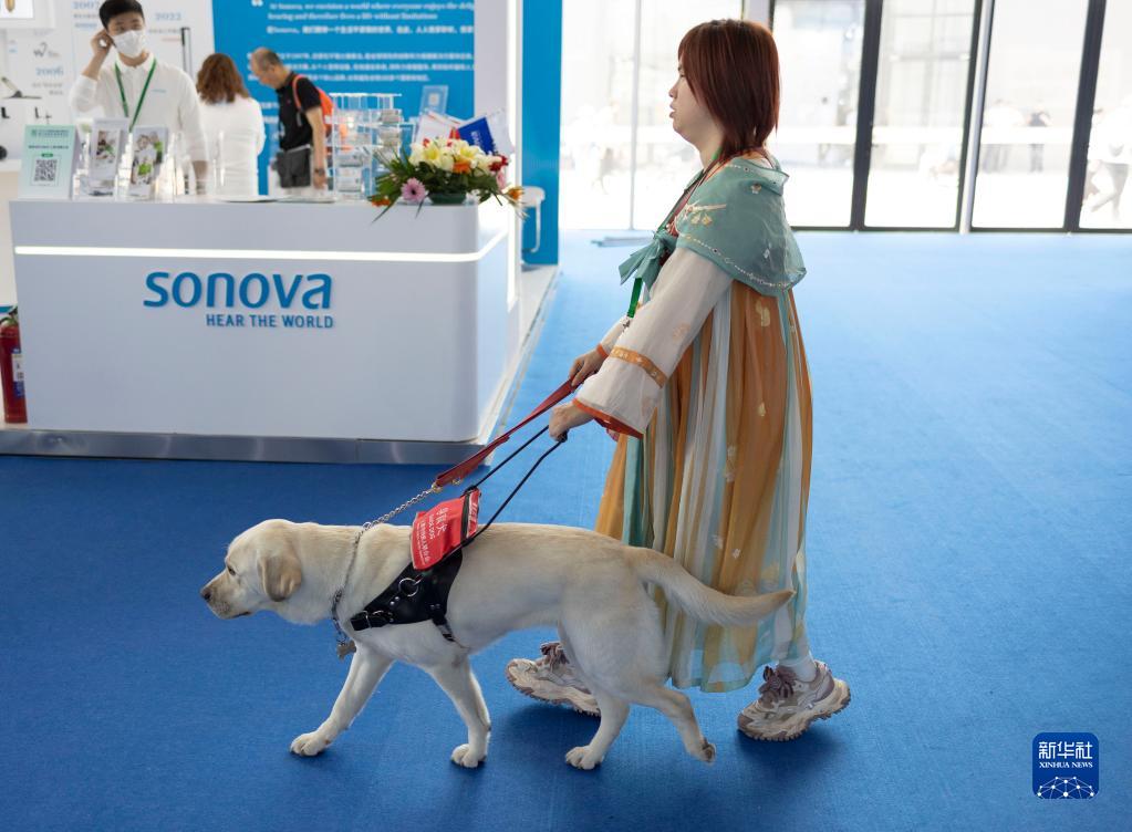 5月21日,在2023中國(guó)國(guó)際福祉博覽會(huì)上,一名視障女孩演示導(dǎo)盲犬如何帶領(lǐng)她走路。