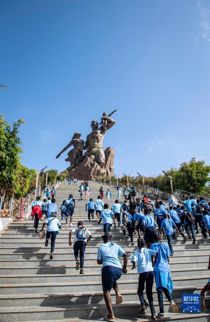 5月12日,在塞內加爾首都達喀爾,游客們在非洲復興紀念碑景區拾級而上。
