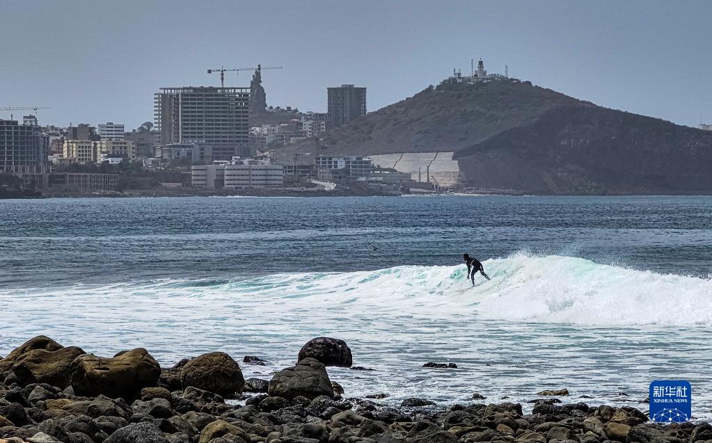 5月14日,一名沖浪愛好者在塞內加爾首都達喀爾的海邊沖浪。
