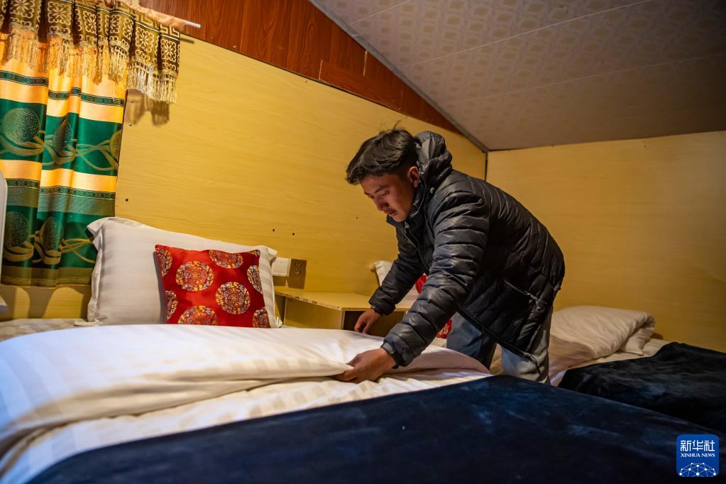 在珠峰游客大本營的帳篷旅館,旦增在整理床鋪(5月13日攝)。新華社記者 孫非 攝
