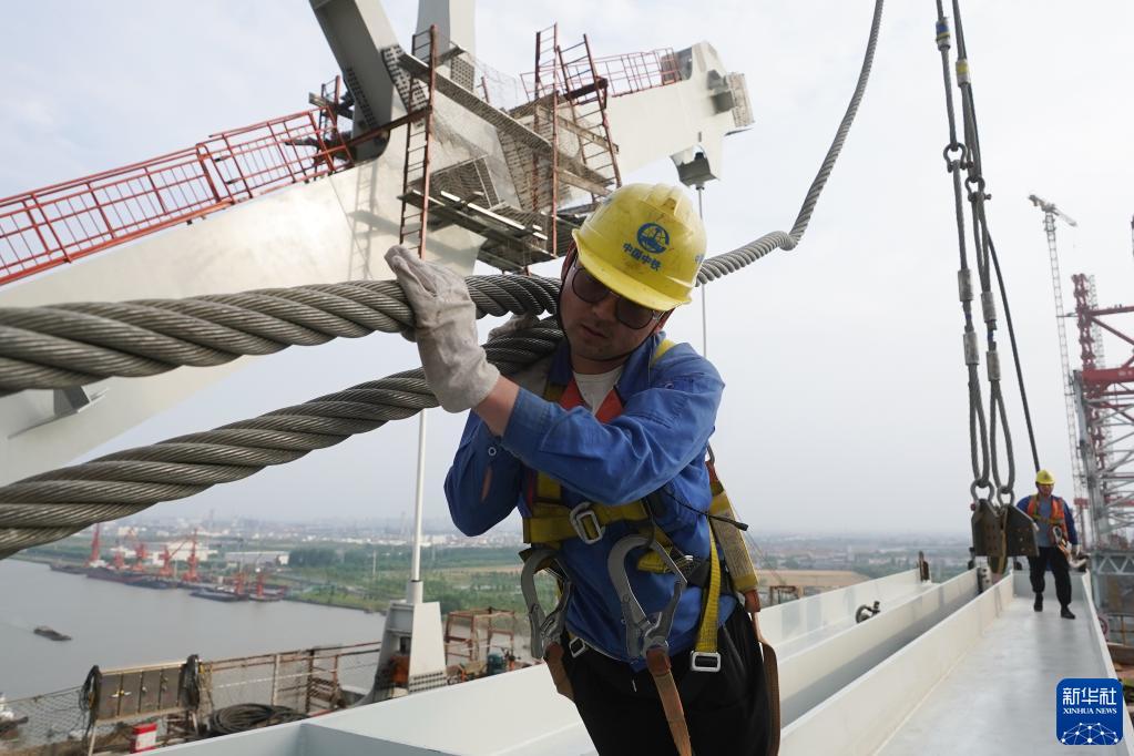 5月21日,在中鐵大橋局常泰長(zhǎng)江大橋錄安洲專用航道橋施工現(xiàn)場(chǎng),工人在卸鋼梁桿件。