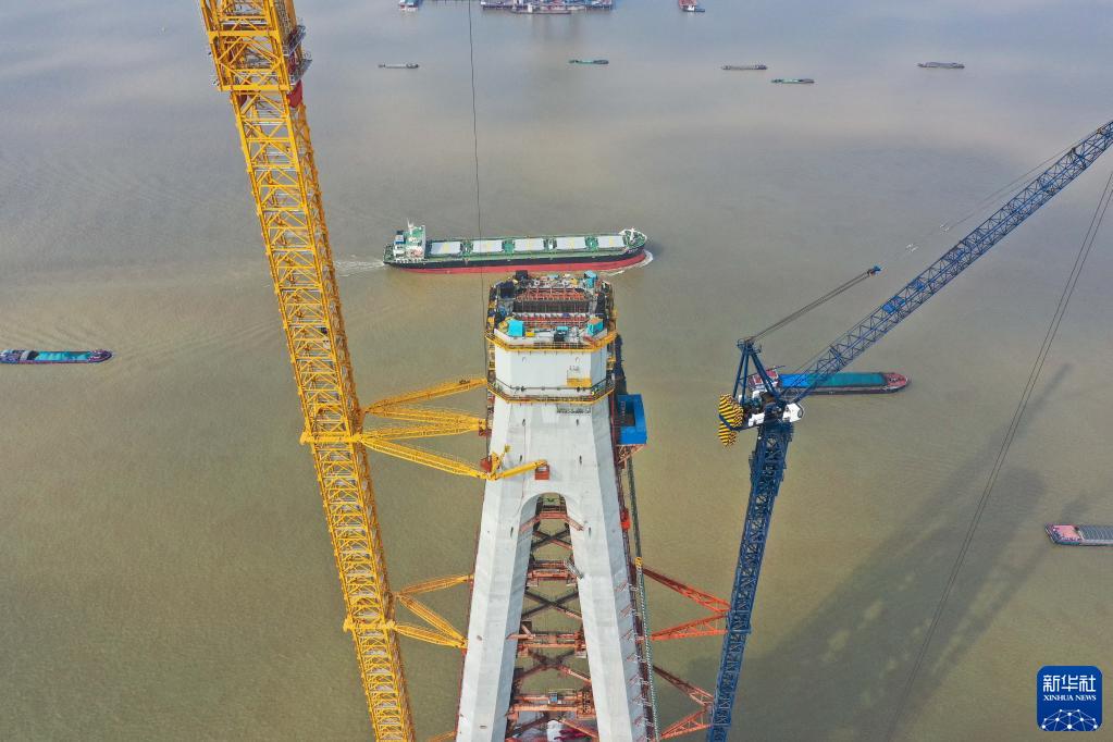 這是中鐵大橋局承建的常泰長江大橋六號主塔施工現場(5月21日攝,無人機照片)。
