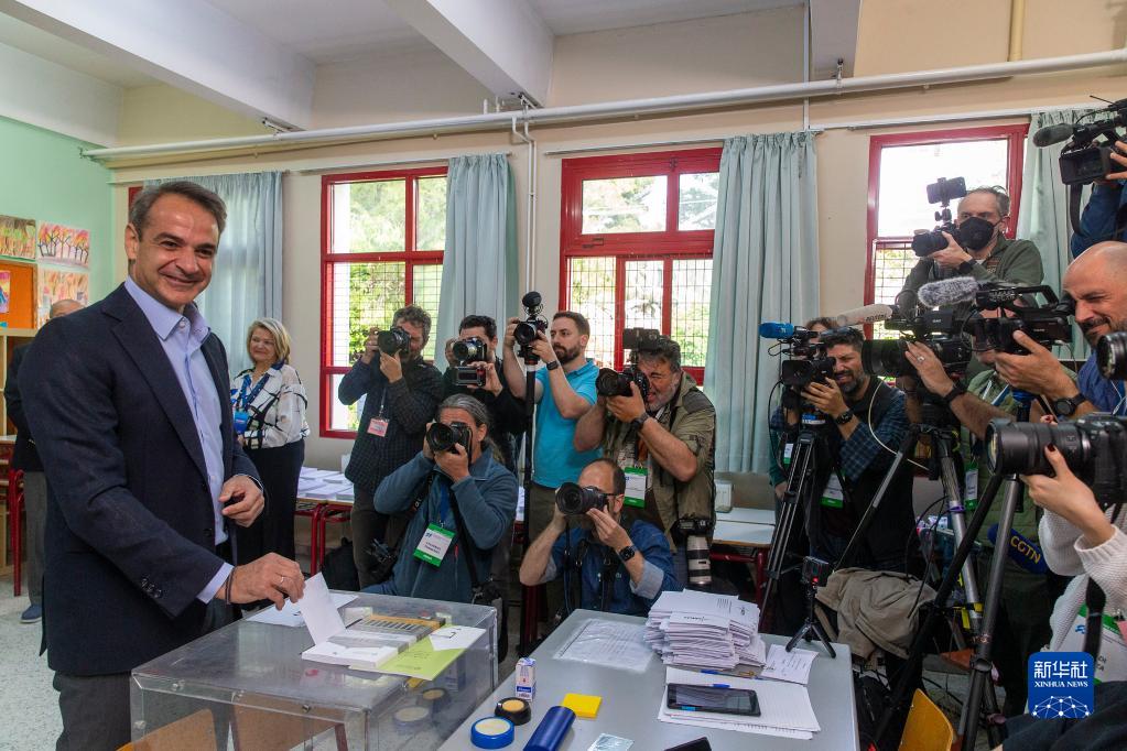 5月21日,希臘總理、新民主黨領導人基里亞科斯·米佐塔基斯在雅典一處投票站投票。