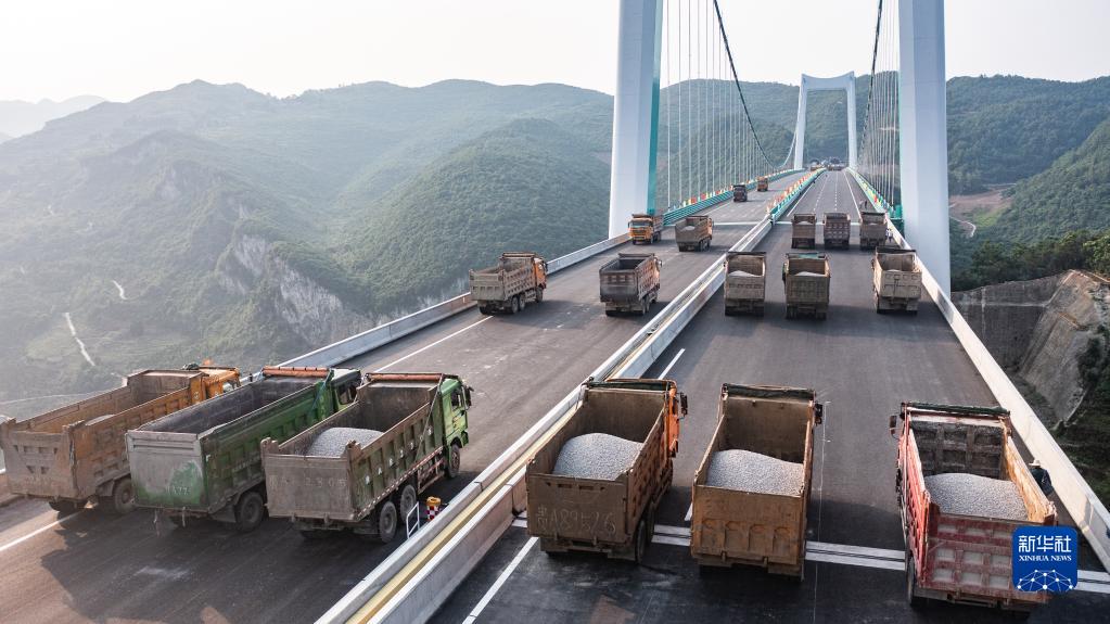 當日,由貴州路橋集團承建的金烽烏江大橋進行靜態荷載試驗,48輛負載砂石的大型貨車有序行駛到固定的位置進行對稱、偏心檢測,檢驗橋梁結構整體的施工質量與受力性能,為橋梁竣工驗收提供科學依據。