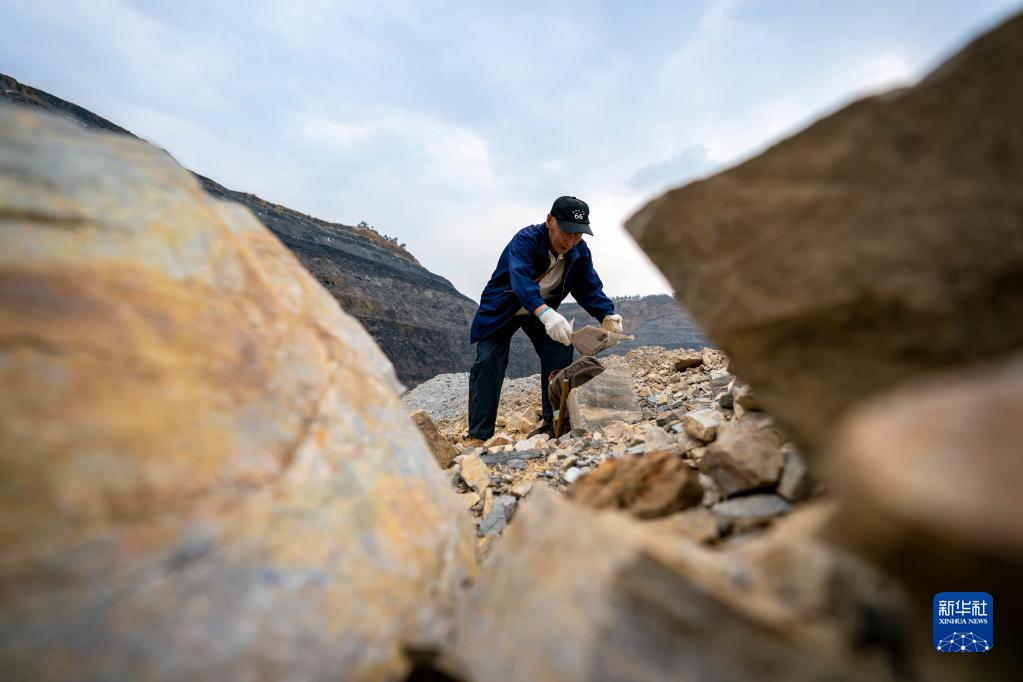 張世山用報紙包裹在昆陽磷礦礦坑內(nèi)找到的一塊化石(5月10日攝)。