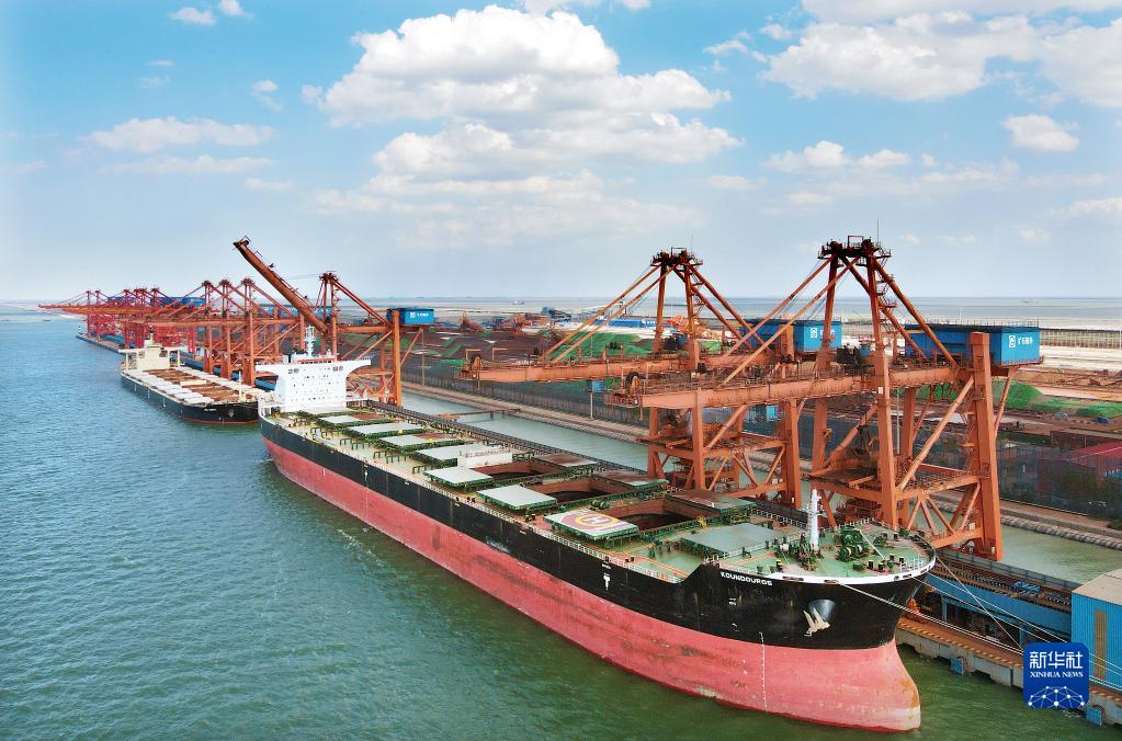 貨輪停靠在滄州黃驊港綜合港區(2021年8月25日攝,無人機照片)。
