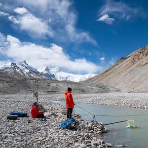 在珠峰登山大本營附近,科考隊員測量絨布河水流速(5月22日攝)。