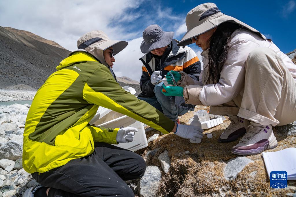 在珠峰登山大本營附近,科考隊員收集土壤樣本(5月22日攝)。