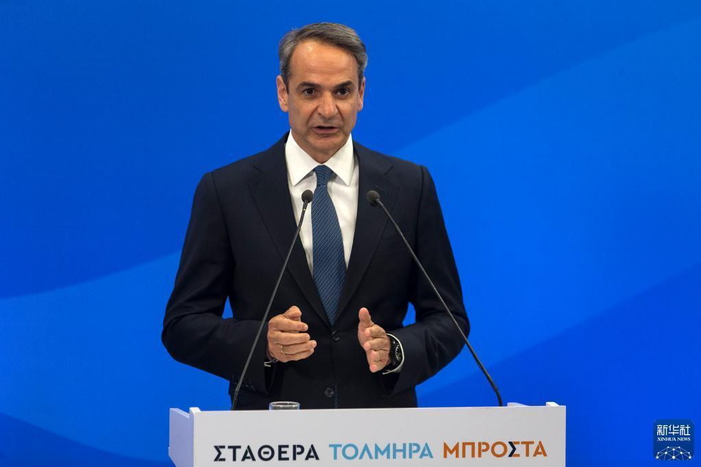 5月21日晚,希臘新民主黨主席、政府總理米佐塔基斯在雅典的新民主黨總部發表大選獲勝感言。
