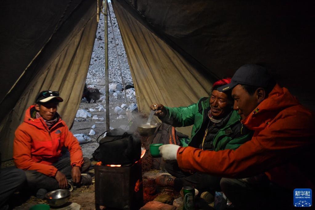 在珠峰登山大本營附近的帳篷里,牦牛工燒水煮茶(5月17日攝)。