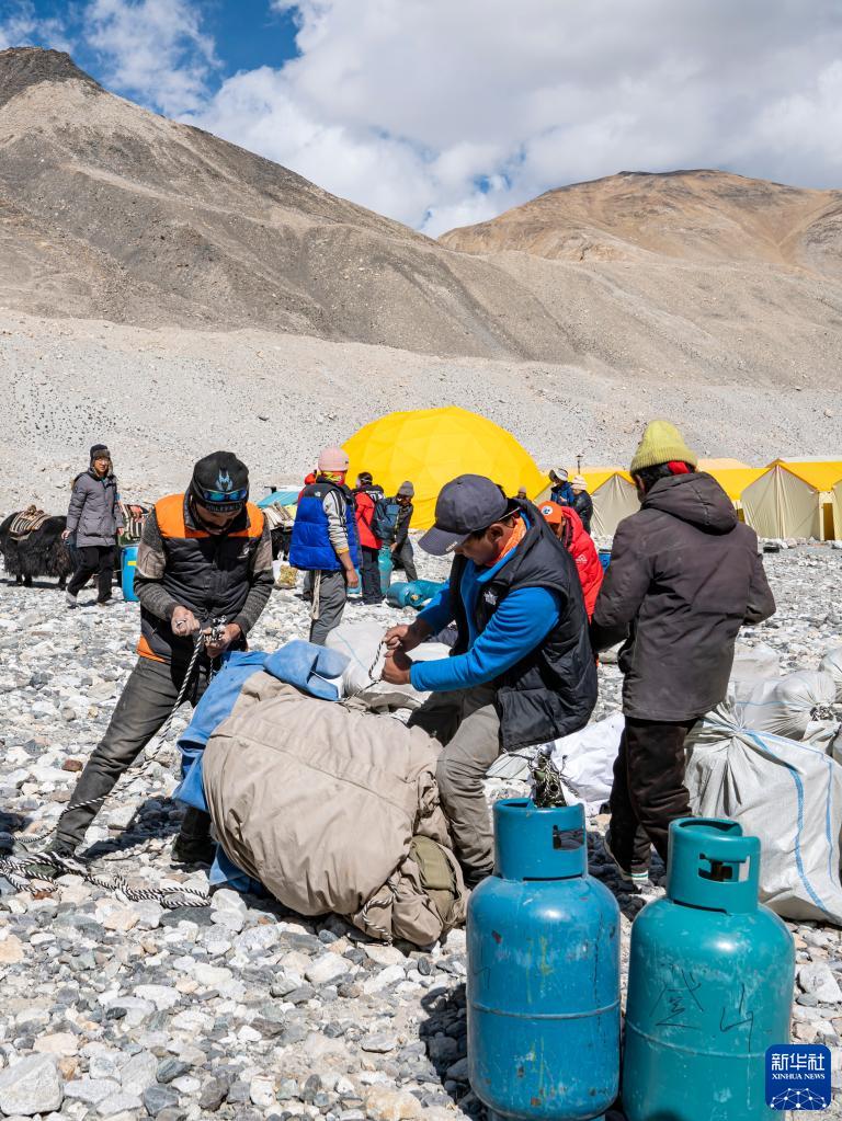 在珠峰登山大本營(yíng),牦牛工捆扎待運(yùn)輸?shù)奈镔Y(5月18日攝)。