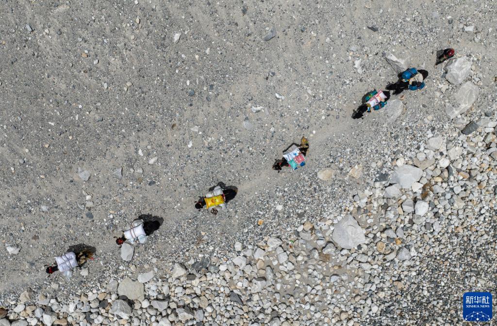 牦牛運輸隊向海拔6500米的珠峰前進營地進發(5月18日攝,無人機照片)。