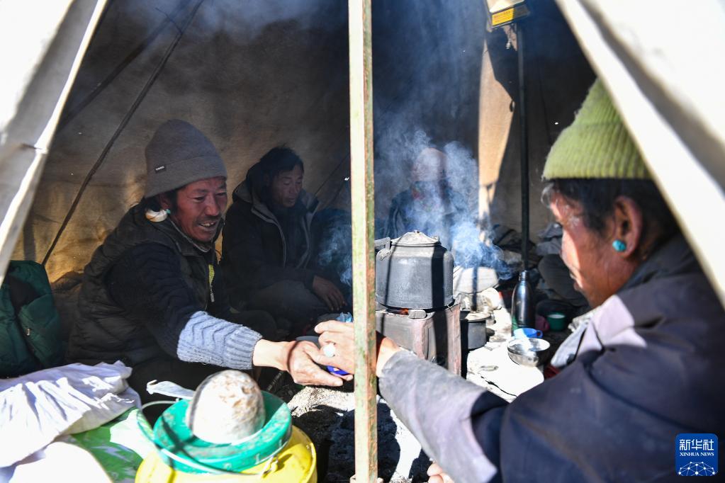 在珠峰登山大本營附近帳篷里的牦牛工(5月18日攝)。