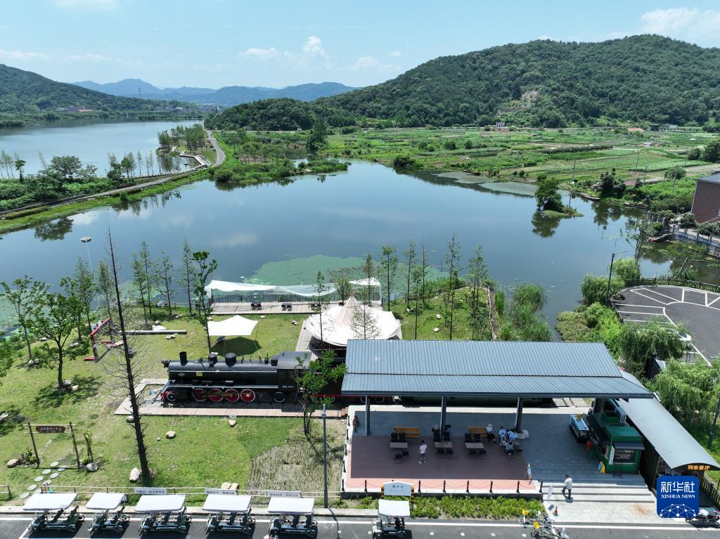 人們在浙江紹興上虞區(qū)驛亭鎮(zhèn)白馬湖畔的“列車營地”休閑、喝咖啡(無人機(jī)照片,6月9日攝)。